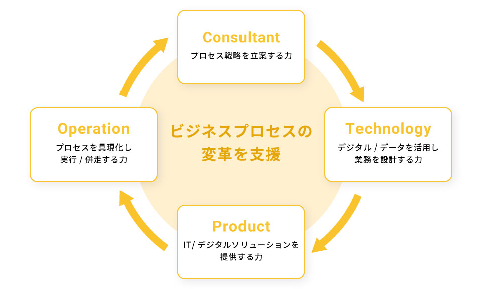 - アウトソーシングにおけるプロセス立案から設計、実装をワンストップで実施。各種テクノロジーを活用したソリューションの提供やデータ活用により、クライアントの経営資源のコア業務への集中やコスト削減に貢献し、事業成長のパートナーとしてビジネス・プロセスの変革に寄与します。
