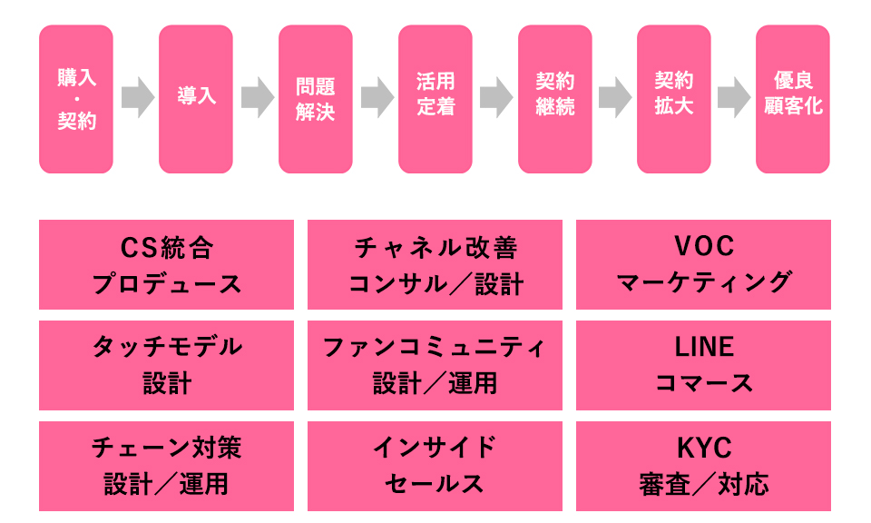 - 戦略策定からデータ分析、DX導入、CRMまで、商品・サービスの持続的な成長プロセスを一気通貫でサポート。生活者の長期利用を促進し、LTVの向上に貢献します。