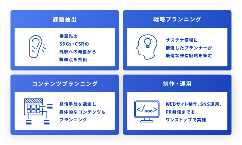 - SDGsやCSR、ESGといったサステナブル領域の対外発信に課題を持つクライアントに、コンサルティングからデジタルを中心とした制作までをワンストップで提供。SUSTAINABLE ENGINEのメンバーやサステナ経営検定の有資格者を中心としたメンバーで行います。