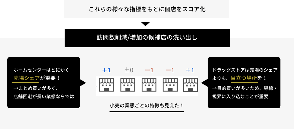 ビッグデータ(ラウンダーの活動データ/POS/納品/店頭シェアなど)をもとに店舗をスコア化。スコアが高い店舗に対して営業コスト(訪店回数)を投入することで、生産性の高い営業活動を実現します。