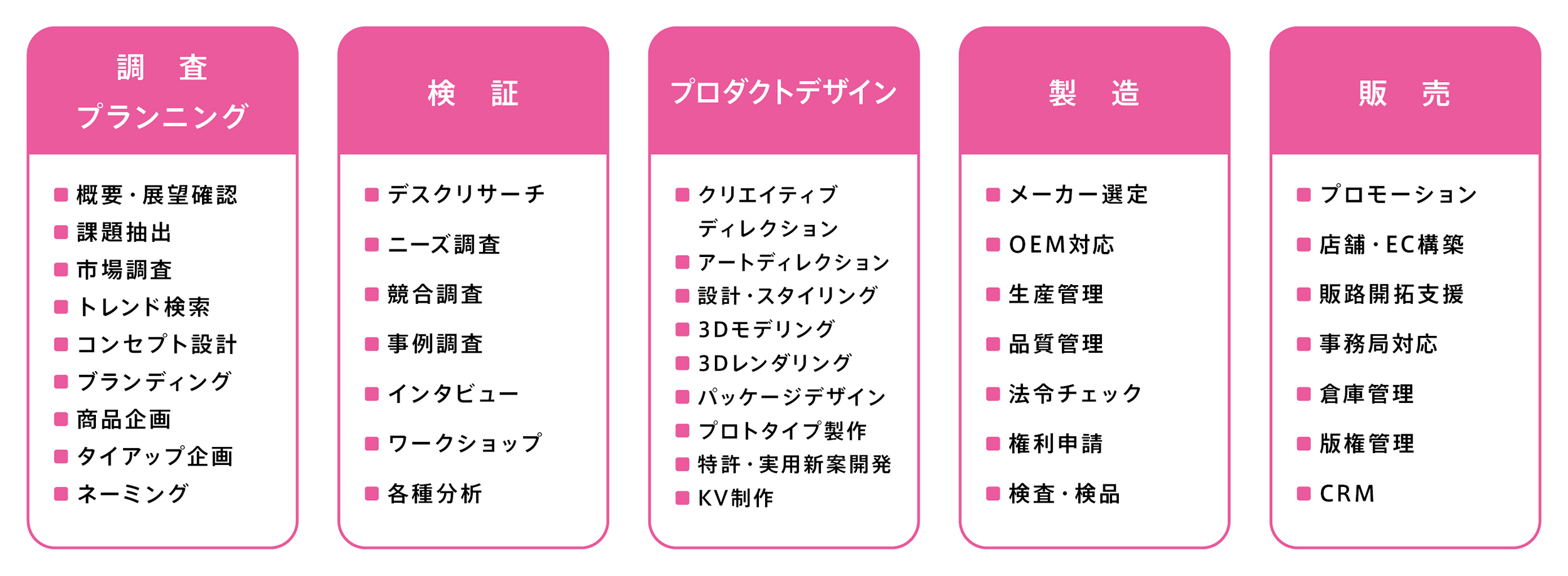 一括サポート調査・プランニングからデザイン・製造・販売までの一括支援はもちろん、クライアントの課題に沿った最適なメニューを提供します。