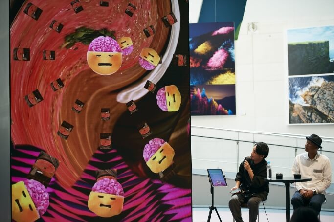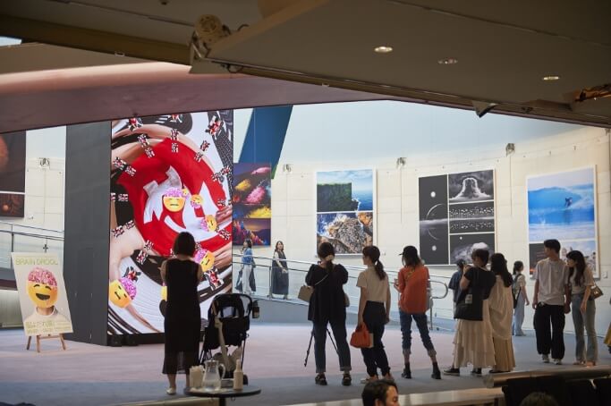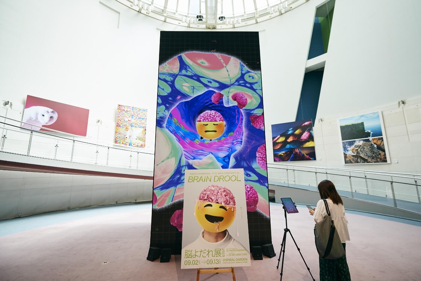 会場にあるAIコンテンツ体験ゾーンには、モノリスをイメージした高さ約5mのAI体験装置を設置。このモノリスには、博報堂グループのフォトグラファーとアートディレクターの感性を学習したCreativity AI「脳よだれくん」を搭載しており、会場の展示写真や来場者が提供する写真を鑑賞させると、本能を直撃する度合いによって、さまざまに脳よだれを噴出させる様子が投影。色々な表情をみせる「脳よだれくん」とのAIアート体験を実施した。