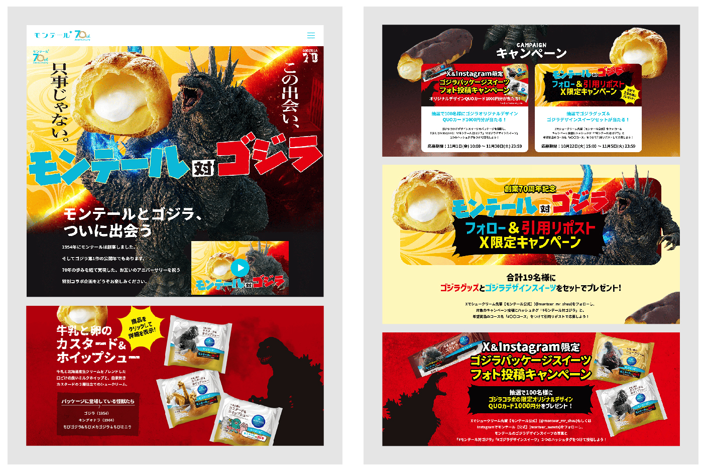洋生菓子を製造・販売する株式会社モンテールの創業70周年施策として、同じく2024年に70周年を迎え、幅広い世代から愛され続けられてきた「ゴジラ」とコラボ。周年記念特別施策として「モンテール対ゴジラ」を企画・実施した。