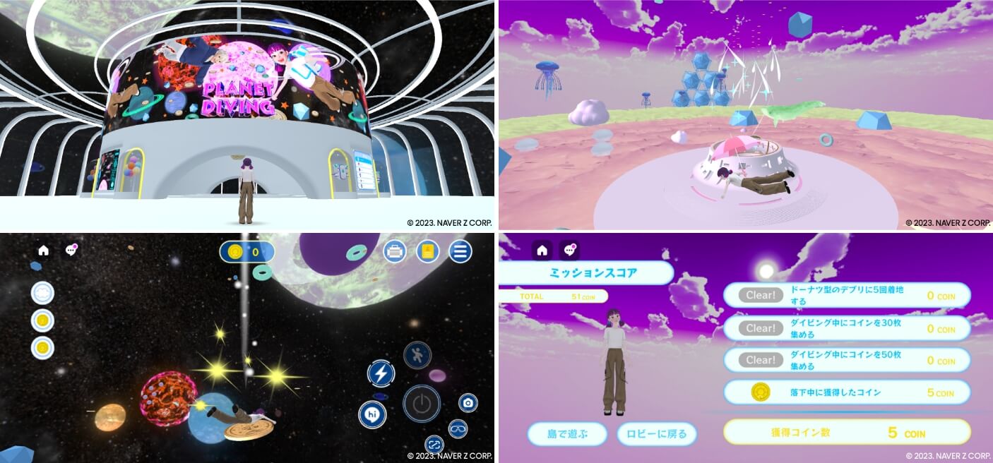※「PLANET-DIVING」は、ユーザーが宇宙空間を浮遊しながら落下するゲームで、ハイポリゴンの3DCG制作ソフトを用いて、リアルタイムレンダリングでイメージを共有しながら開発を進め、「今までにない体験」と「高いクリエイティブ性」を重視した、新しい体験価値を提供。